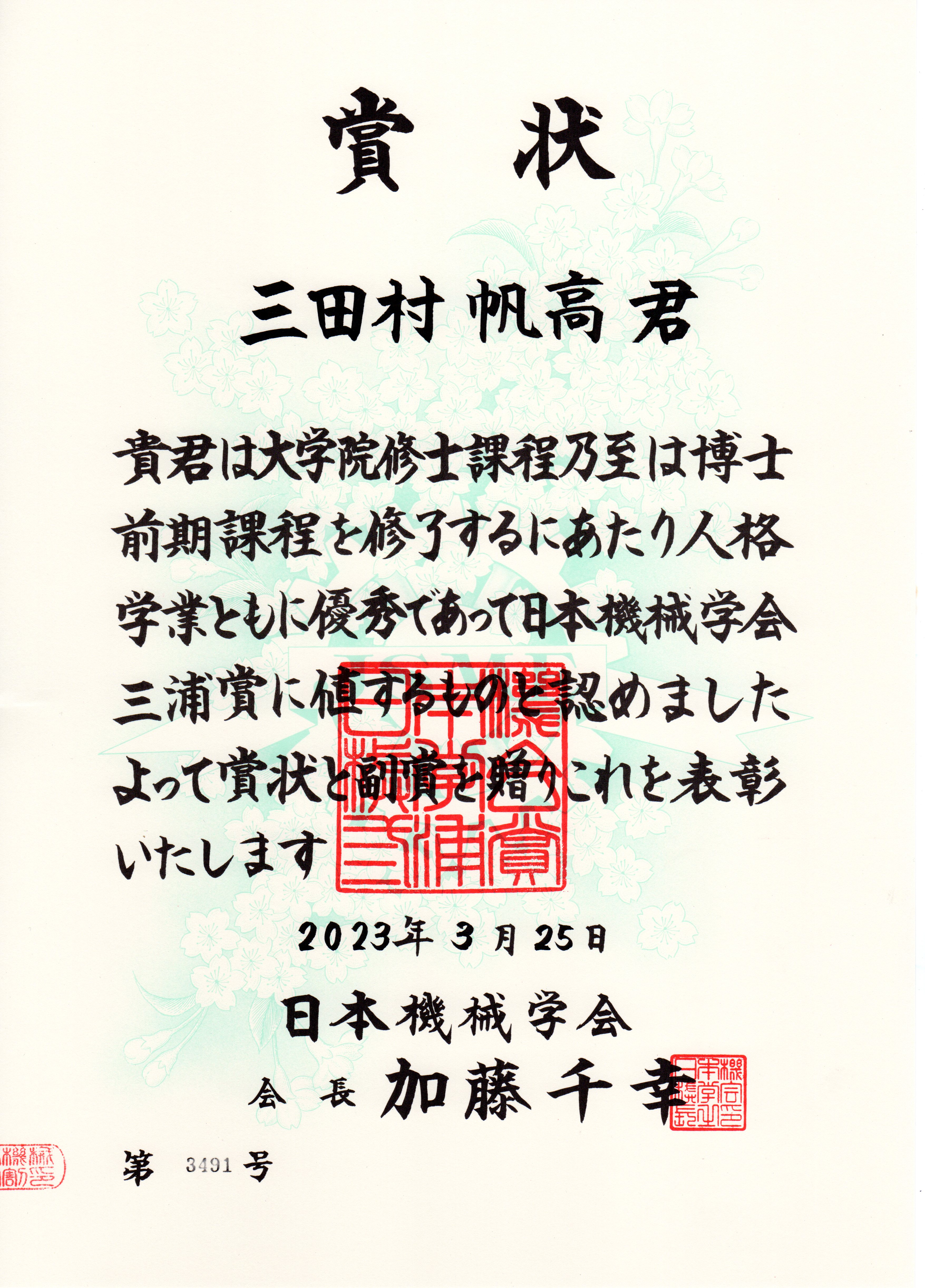 - 2023年3月 日本機械学会三浦賞 三田村帆高(大学院2年生)