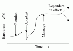 出会いはdH/dtを急激に変化させます.例えば,転職して給料の良い会社と出会えば,月々の貯蓄に回せる金額を急に増やすことになります.しかし,預金残高のH(t)は急激に変化しません.また,良い塾の先生に教えてもらえるようになっても,急に模擬テストの成績が良くなることはなく,徐々に良くなって行きます.すなわち,dH/dtが大きくなって,上向きになったといえます.これらのようにdH/dtをプラスにする出会いだけでなく,マイナスにする出会いも勿論あります.この考え方から,出会いがプラスかマイナスかを判断できるのは,少し時間が経ってH(t)に変化が現れてからということがわかると思います.良い出会いなのか悪いのかは,出会いの瞬間に判断できないのです.以上の例では,お金や成績などの狭い観点から説明しましたが,以下では,H(t)をこのような内容が組み合わされた一般的な幸せの大きさと考えてください.なお,宝くじに当たったり,事故にあったりするとH(t)に急激な変化が現れます.これらは,当たりくじや事故との出会いですが,本稿では別のものと考えます.